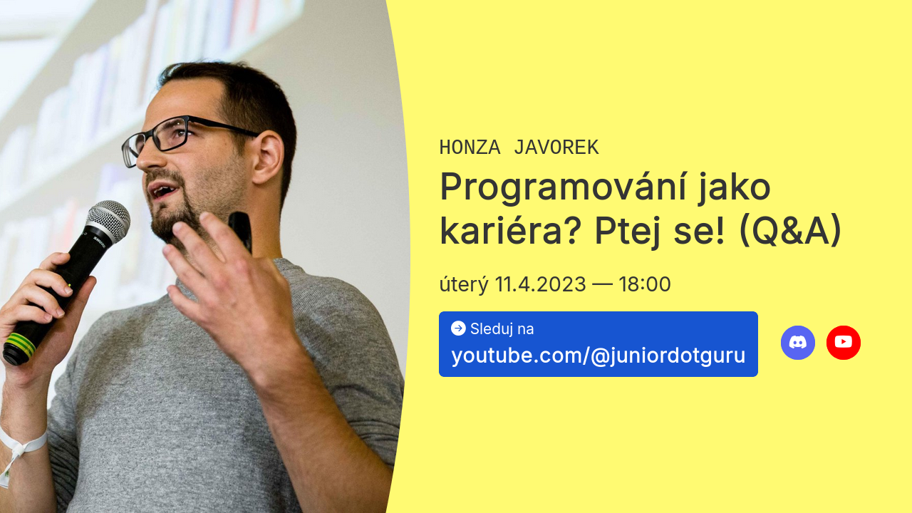 Akce je online, zároveň pro členy junior.guru/club na Discordu i veřejně na YouTube. V obou případech můžeš psát otázky do chatu a Honza se na ně snaží odpovídat. Z akce je veřejný záznam.