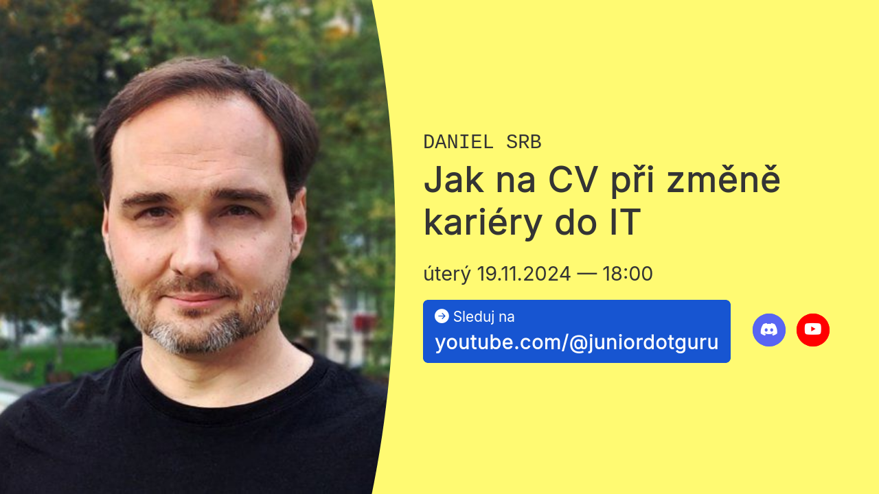 Daniel Srb, který viděl spoustu CV, když nabíral vývojáře, pracoval také jako designér a již několik let provází klienty změnou kariéry do IT, ukáže, jak vytvořit efektivní životopis pro hledání první práce v IT. Představí i šablonu, která tě zdarma provede tvorbou kvalitního CV.