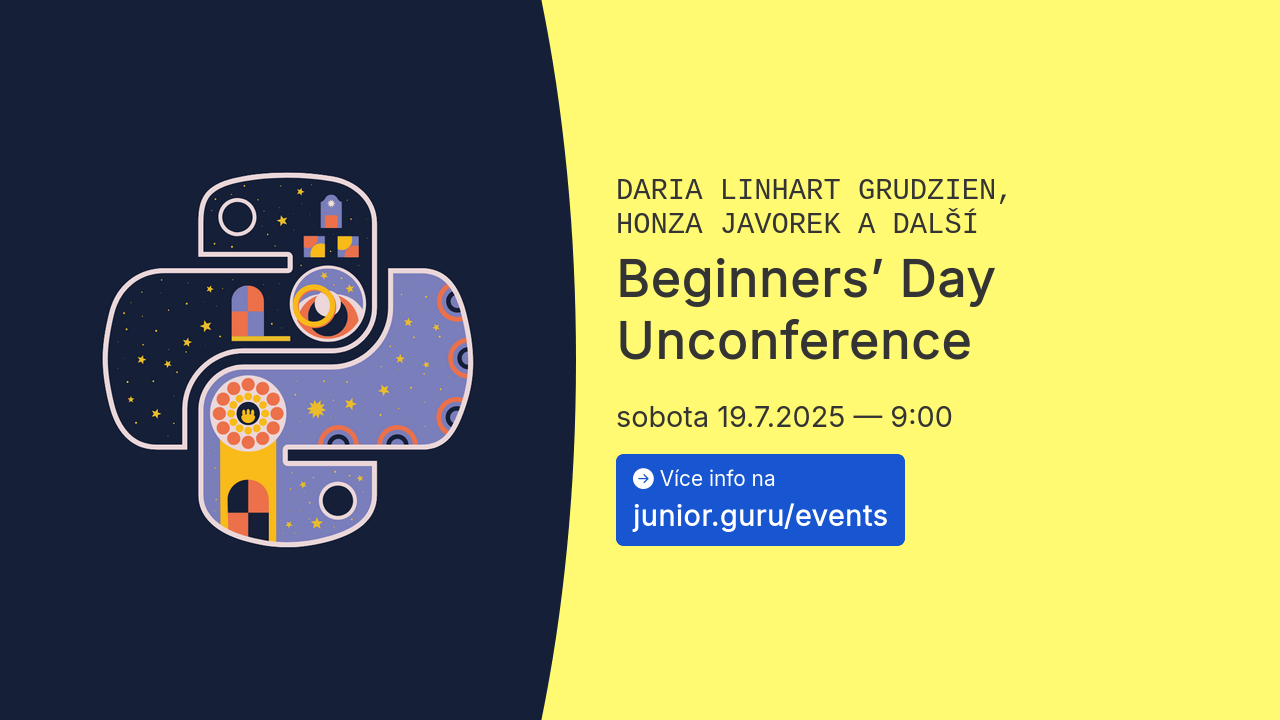 Klub junior.guru pořádá vzdělávací akce. Toto je jeda z nich. Už proběhla, ale najdeš tady o ní všechny informace. Pojetí akcí je vždy vyloženě pro začátečníky. Žádná záplava odborných „termitů“, které ti nikdo nevysvětlil!