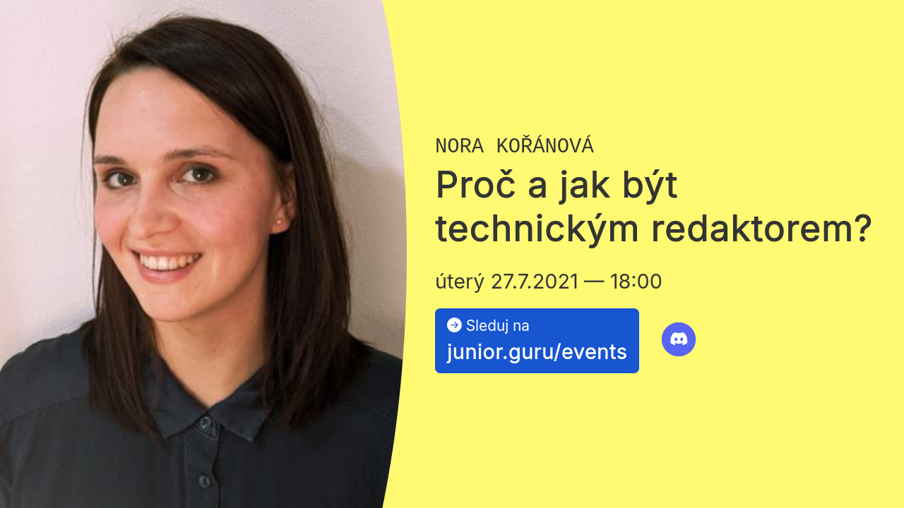 Technical writer je zajímavá a žádaná práce, málo kdo ale ví o co v ní běží nebo že vůbec taková kariérní cesta existuje. Přijď si poslechnout, jak se z absolventky obecné lingvistiky stala tech writerka. Nora Kořánová ti poví, s čím se běžně v práci potýká, co ji na tom baví, nebaví a jaké dovednosti se jí hodí. Nebudou chybět ani tipy na to, jak se technical writerem stát.